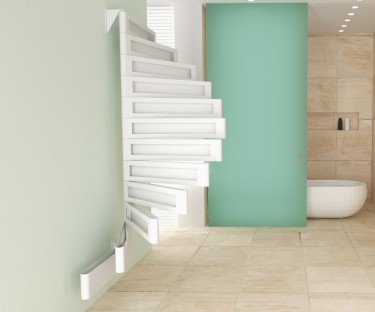 Vano utilizes the 180° rotating blades to open a hidden clothing rack. This way, towels and other fabrics can dry more quickly without overlapping like they tend to do on traditional bathroom radiators.